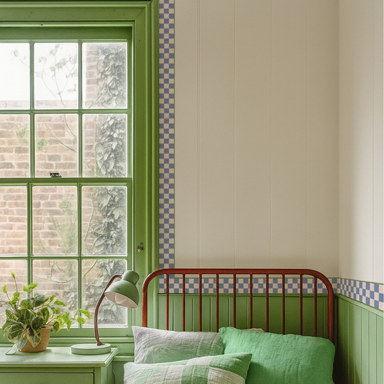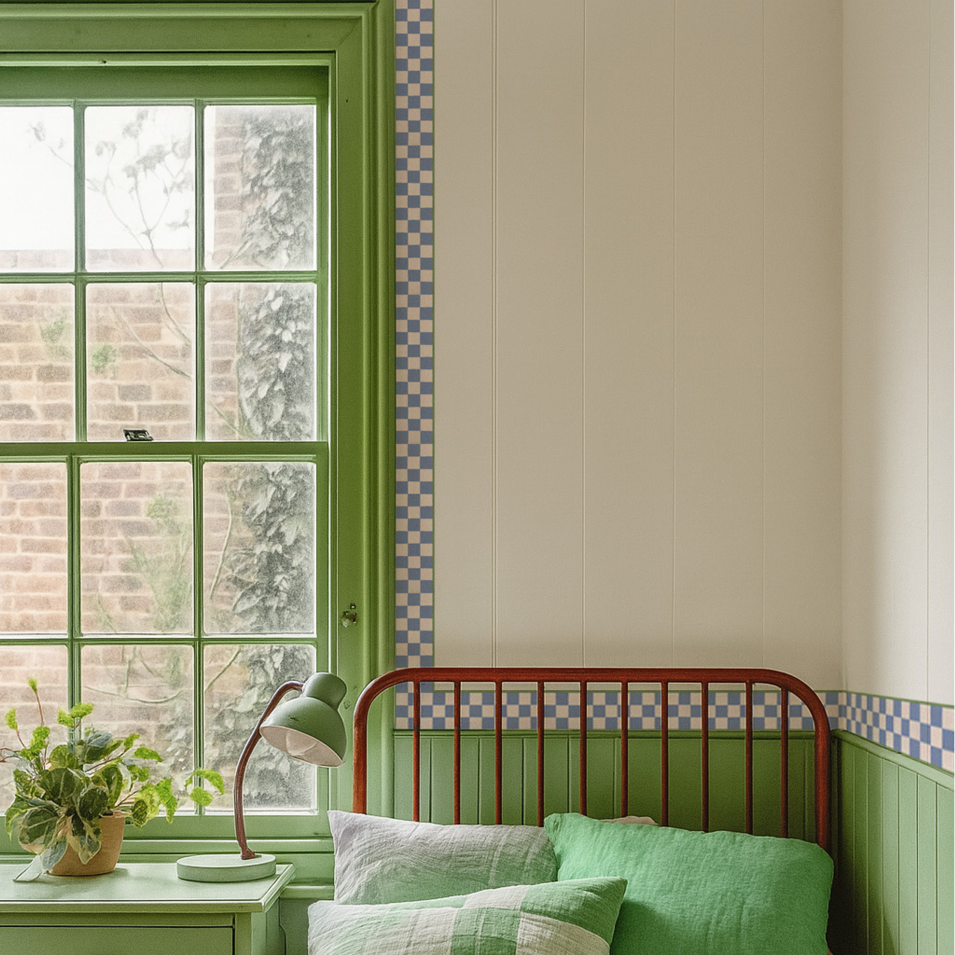 Avec sa composition graphique à damier, la frise de papier peint CLYDE est l’accessoire idéal pour apporter une touche décorative affirmée, en un clin d’œil. Jouée seule sur un mur ou associée à un papier peint, elle habille l’espace avec style et simplicité. Pensée en duo, la collection de frises BONNIE & CLYDE invite à redessiner les volumes, à rythmer les surfaces et à révéler le caractère de chaque intérieur. Une manière élégante et audacieuse de repenser sa décoration sans tout changer !