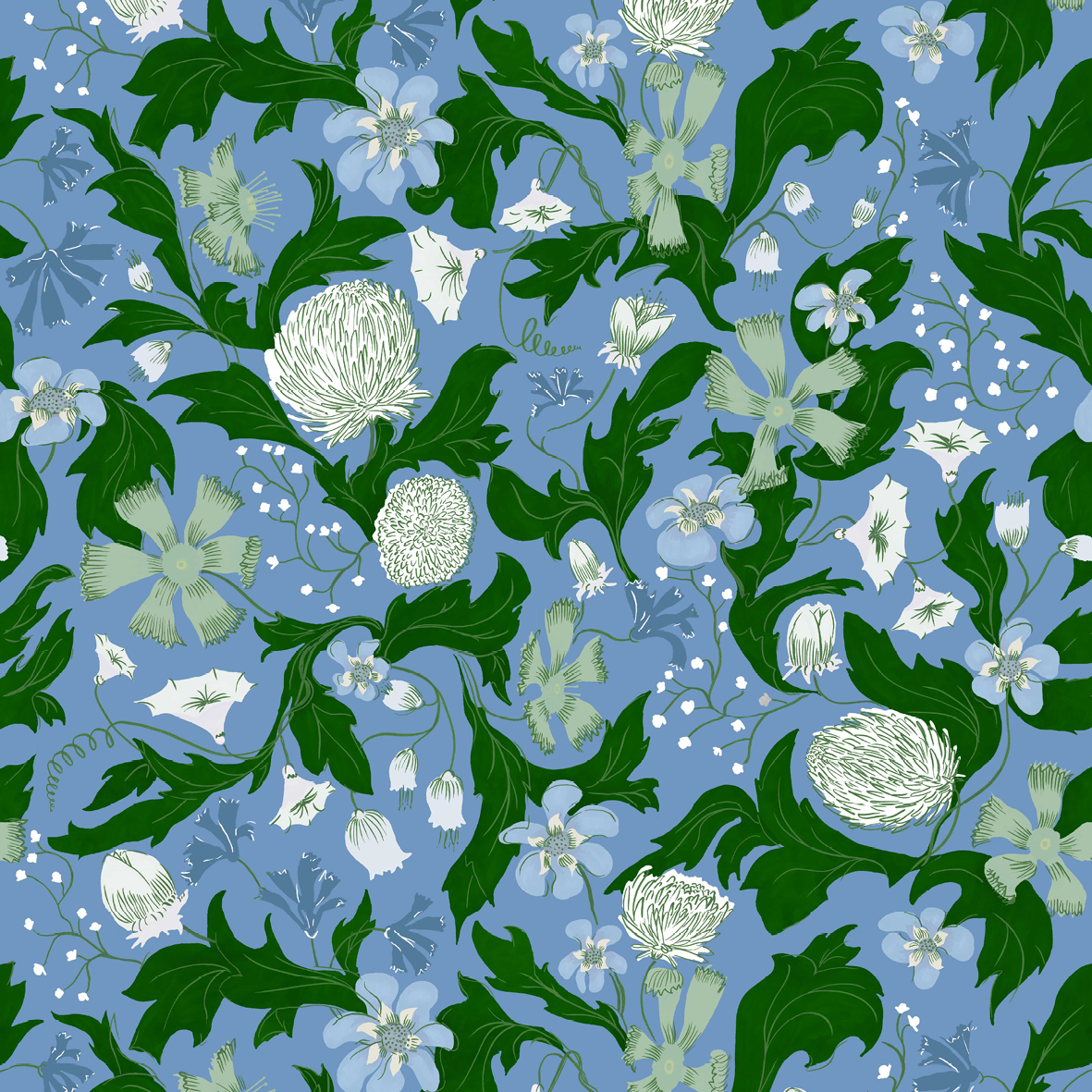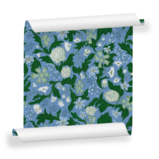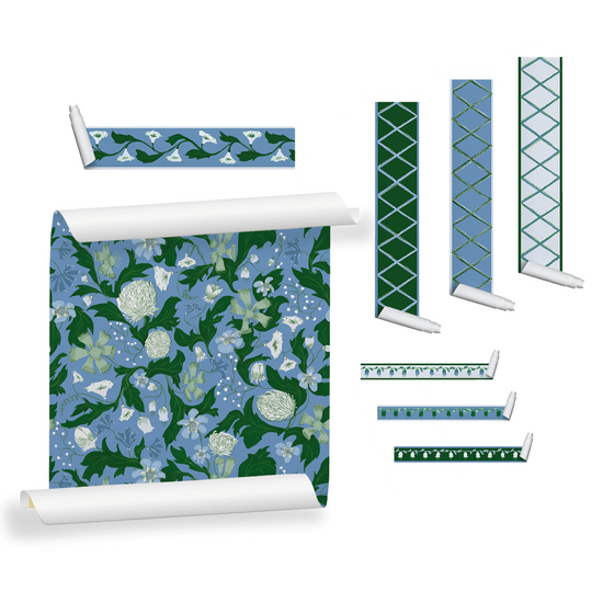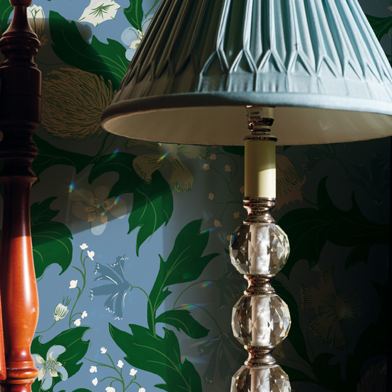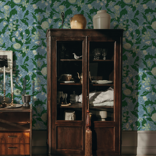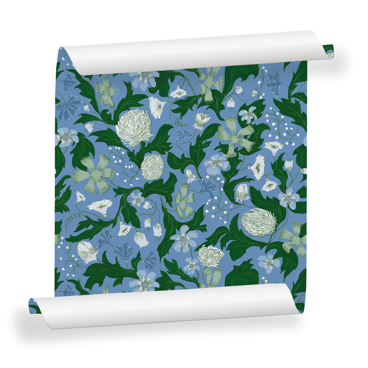 Papier peint fleuri, PRUNE est un décor élégant et empreint de poésie. Ses délicats motifs posés sur un fond bleu évoquent le maximalisme et la richesse chromatique des indiennes, ces textiles emblématiques des XVIIᵉ et XVIIIᵉ siècles. Entièrement dessiné à la main, ce motif révèle une subtile profondeur tout en conservant une grande légèreté visuelle.