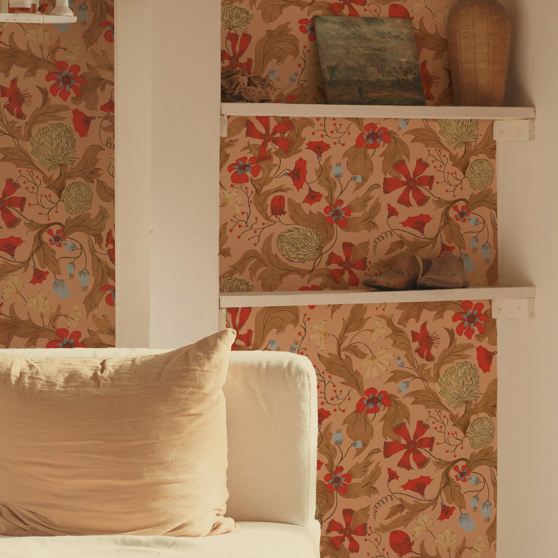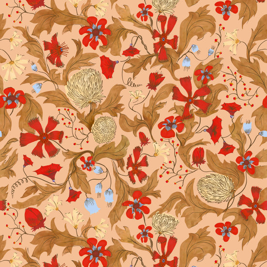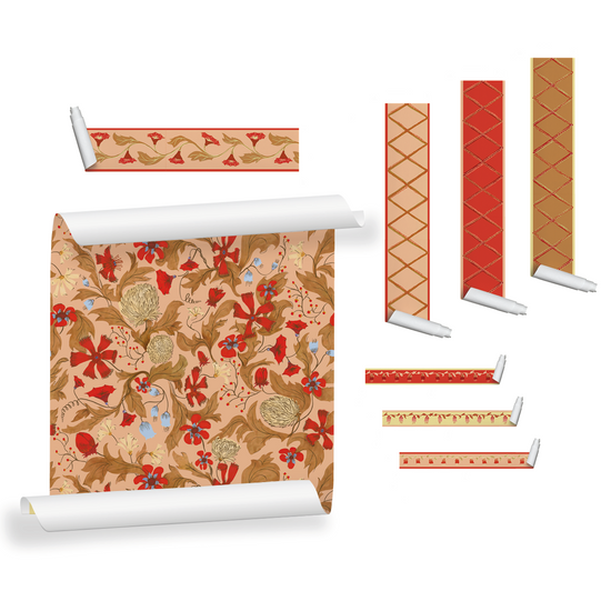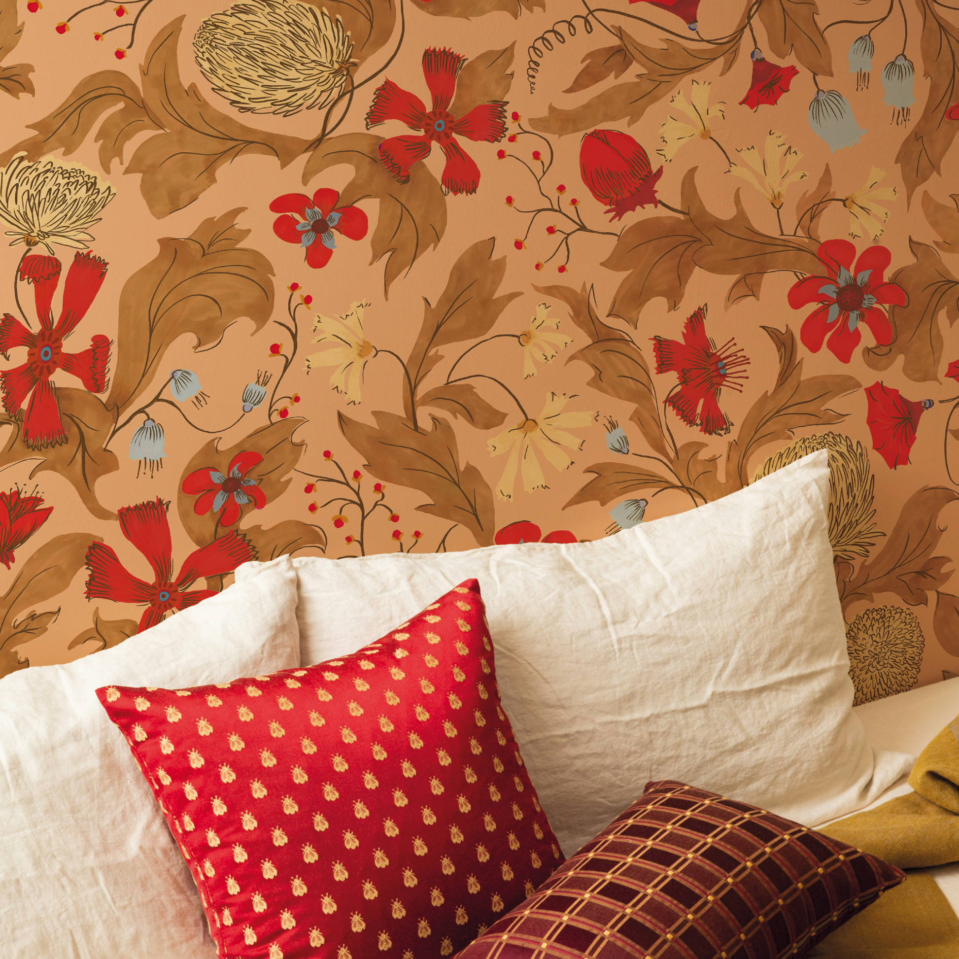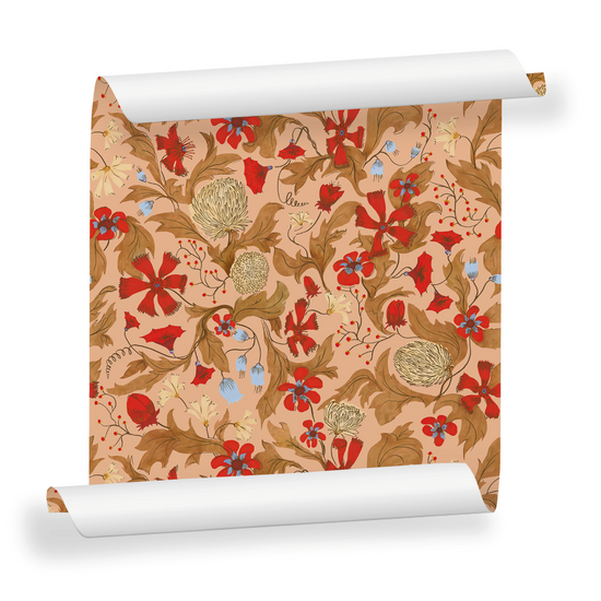 Papier peint fleuri, PRUNE est un décor élégant et empreint de poésie. Ses délicats motifs rouges posés sur un fond rose évoquent le maximalisme et la richesse chromatique des indiennes, ces textiles emblématiques des XVIIᵉ et XVIIIᵉ siècles. Entièrement dessiné à la main, ce motif révèle une subtile profondeur tout en conservant une grande légèreté visuelle.